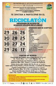 Tulum, Q. Roo, Jueves 14 de Enero de 2021, poderycrítica.- La Dirección General de Ordenamiento Ambiental, Urbano y Cambio Climático dio a conocer las fechas que a lo largo del año 2021 tendrán para los programas “Adopta Vida” y “Reciclatón”, los cuales se llevan a cabo de forma continua cada mes y contribuyen al cuidado del medio ambiente pues los desechos obtienen una adecuada disposición; cabe destacar que en el caso del Reciclatón, durante la administración del presidente municipal, Víctor Mas Tah, se elevó en un 200 % la cifra del reciclaje de desechos en Tulum.