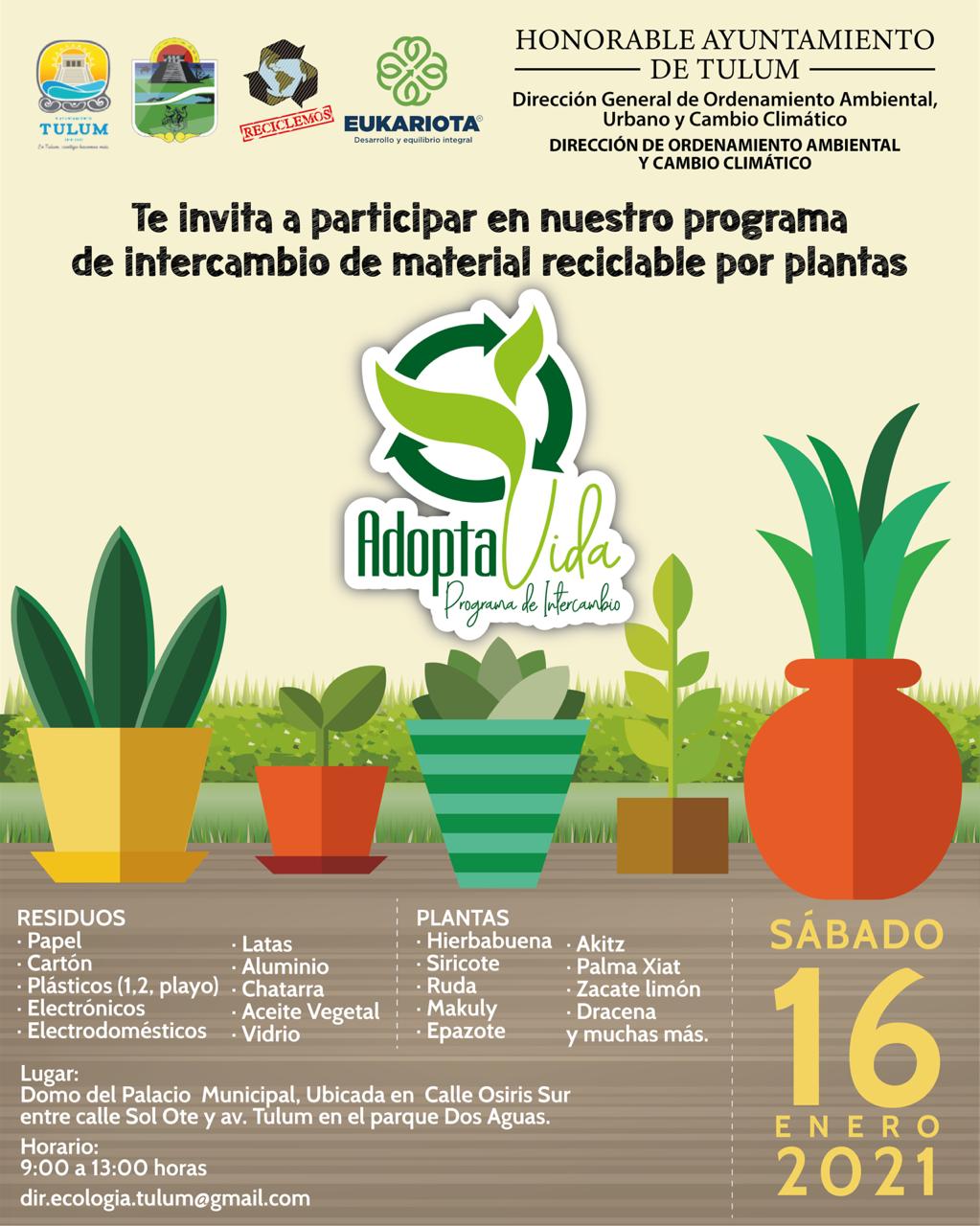 El primer programa de intercambio del año tendrá lugar este 16 de enero a través de Adopta Vida, el cual intercambia plantas por material reciclable, será en el domo del parque Dos Aguas, a un costado del palacio municipal; en tanto que el primer Reciclatón del año se llevará a cabo el 29 de enero en el estacionamiento del edificio del Ayuntamiento sobre la avenida Osiris.