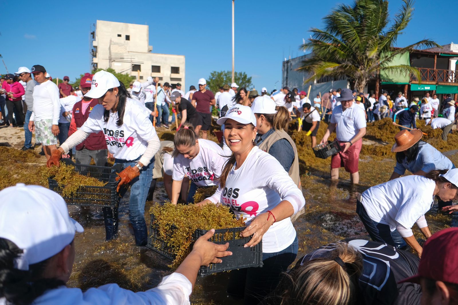 Para esta primera jornada permanente contra el sargazo participaron más de 250 colaboradores del Gobierno del Estado distribuidos en grupos de 20 a 30 personas diversos puntos de las playas de Mahahual. Mara Lezama recordó que hace unos años implementó un programa similar cuando fue presidenta de Benito Juárez.