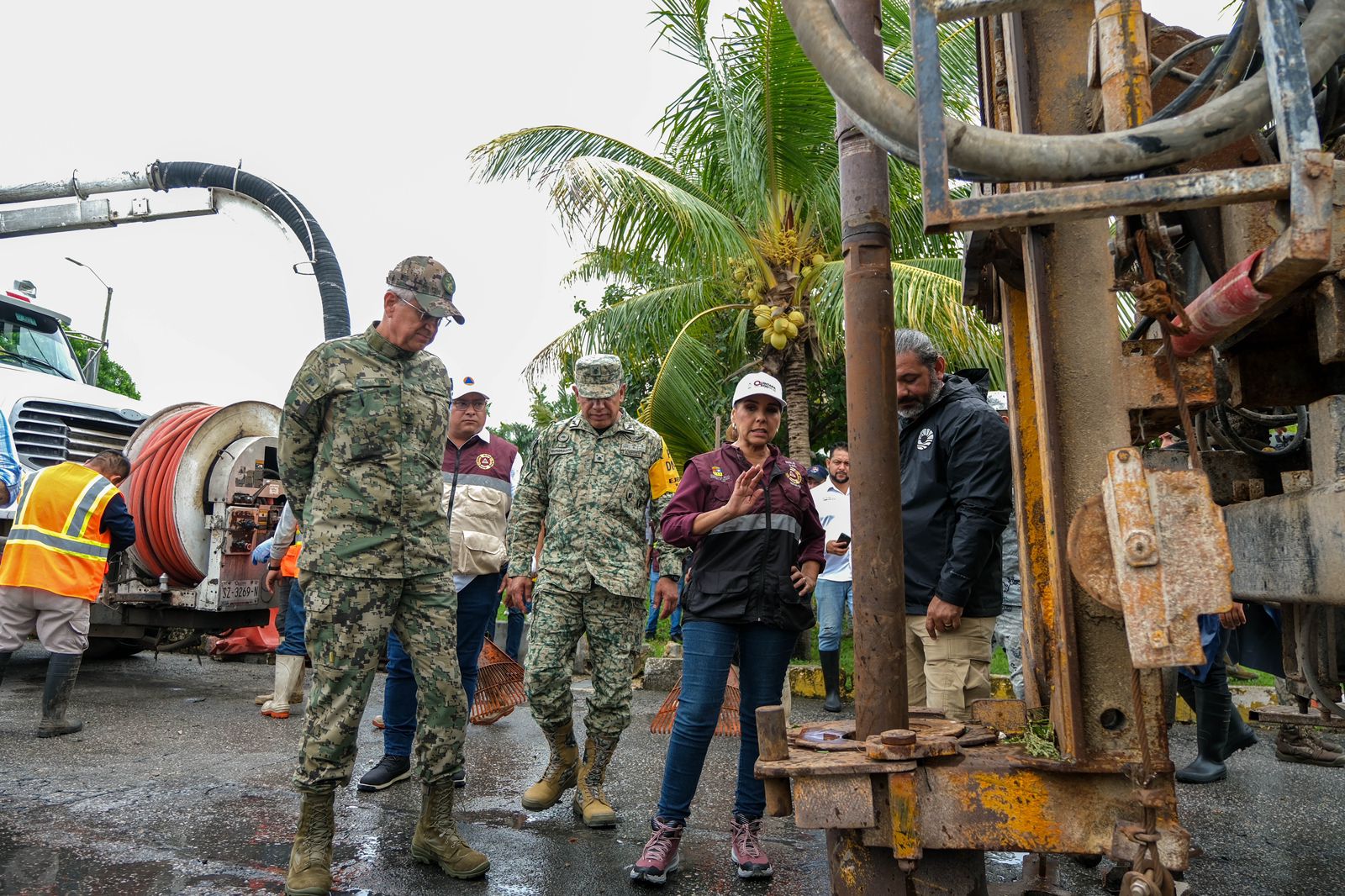 Después de presidir la sesión extraordinaria del Comité Estatal de Protección Civil y de informar a la población de los últimos reportes meteorológicos en relación con la tormenta tropical, la gobernadora de Quintana Roo salió a las calles de Cancún para supervisar puntos de atención prioritaria.