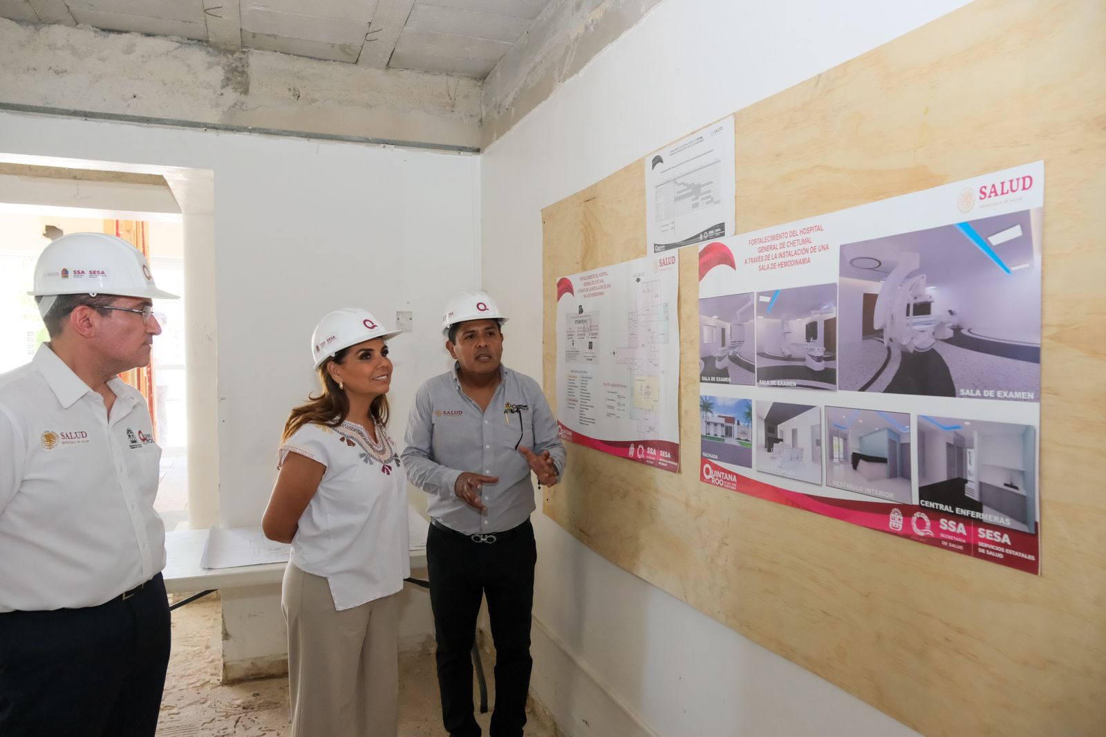La titular del Ejecutivo informó que la transformación de Chetumal sigue adelante, para que brille nuevamente la capital del estado, y ahora gracias al apoyo del gobierno federal, a través de la Secretaría de Salud, la obra de la sala de Hemodinamia tiene un avance del 60%.