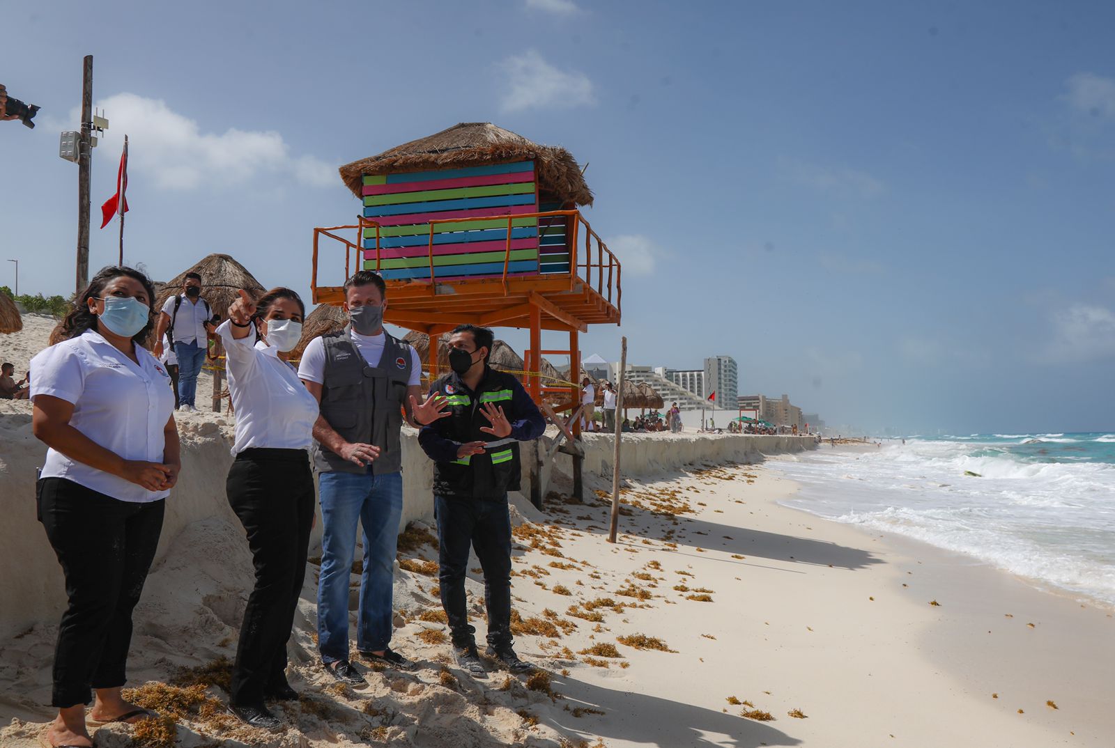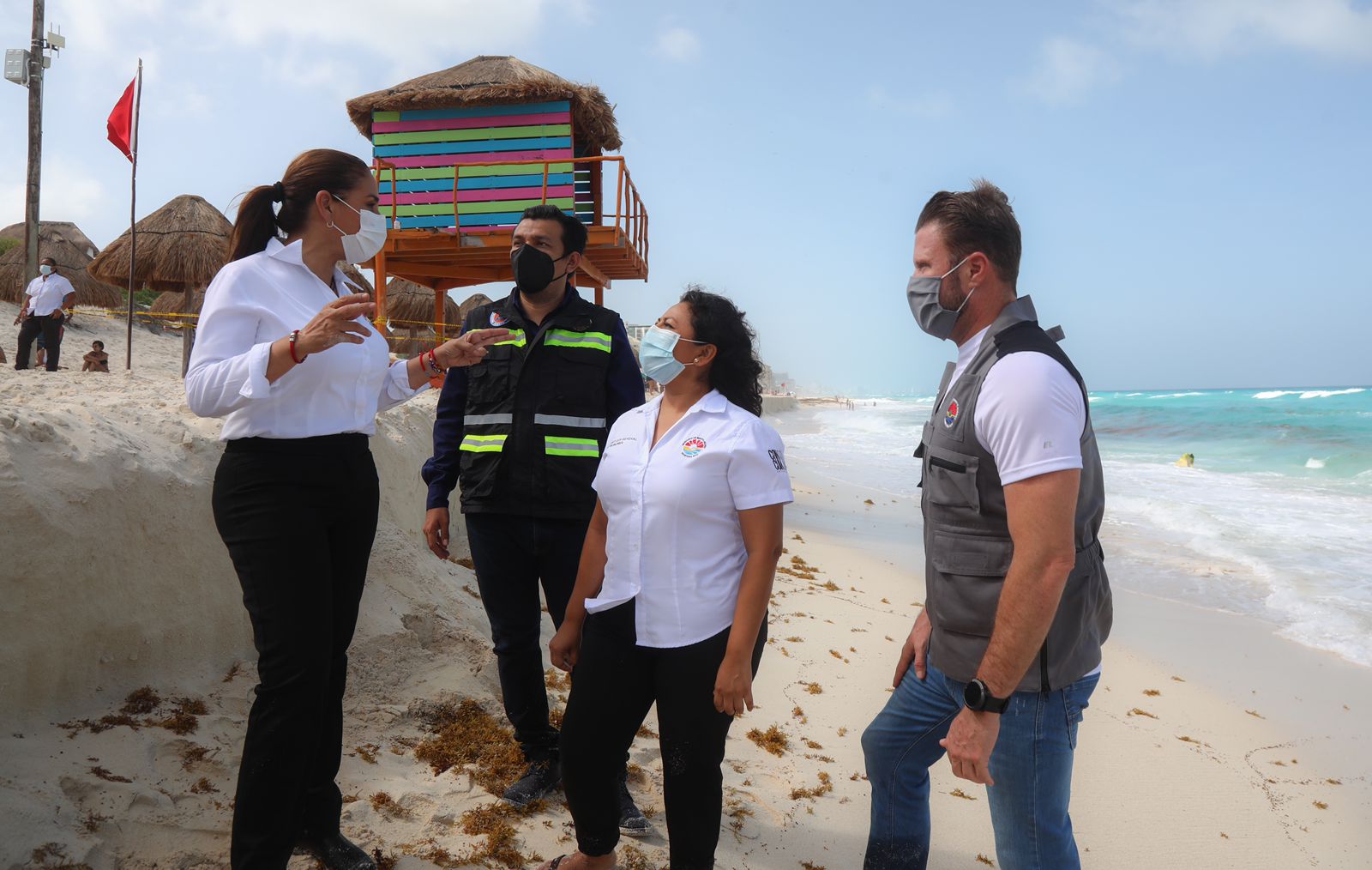 Cancún, Q. Roo, Viernes 18 de junio de 2021, poderycrìtica. – La Presidente Municipal Mara Lezama supervisó las afectaciones ocasionadas por las lluvias registradas en las últimas 24 horas en Playa Delfines y verificó la aplicación de medidas para la seguridad de bañistas locales y visitantes.