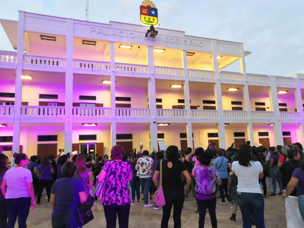 Posteriormente el grupo de mujeres marchó hasta el Palacio de Gobierno en donde se manifestaron, con mantas y carteles. En las columnas del edificio colocaron cartulinas y mantas como señal de protesta.