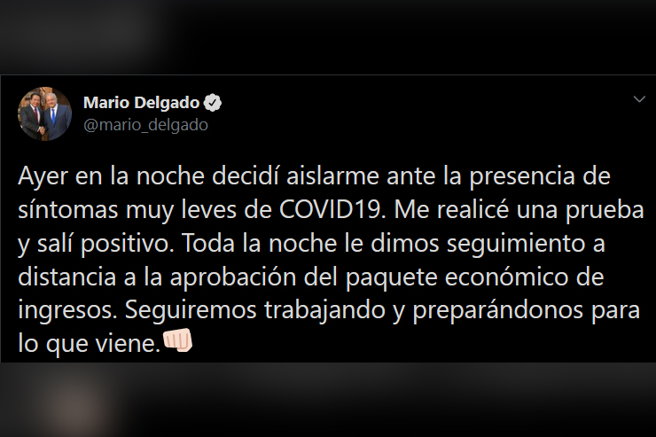 Ciudad de México, Miércoles 21 de Octubre del 2020, poderycrítica.- El candidato a la dirigencia nacional de Morena Mario Delgado, indicó que dio positivo a Coronavirus Covid-19 tras realizarse la prueba.