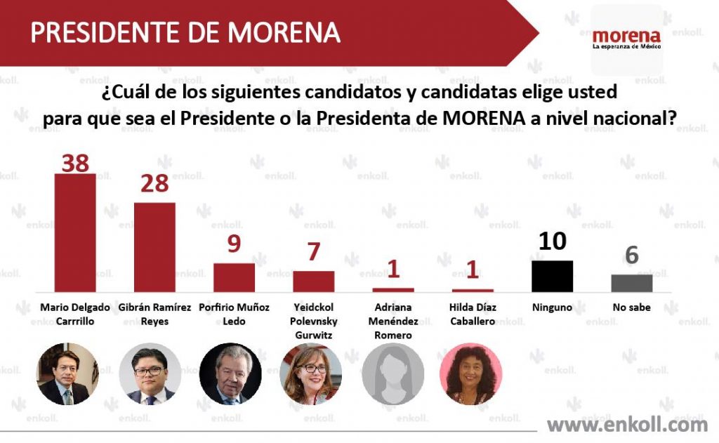 La pregunta textual fue: “¿Cuál de los siguientes candidatos y candidatas elige usted para que sea el Presidente o la Presidenta de MORENA a nivel nacional?”. Otros resultados que arrojó la encuesta fue que el diputado Porfirio Muñoz Ledo registró 9%; mientras que la anterior dirigente nacional Yeidckol Polevnsky Gurwitz se quedó con 7 puntos porcentuales.