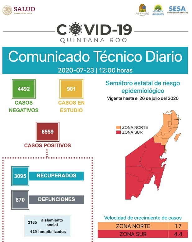 «Hasta las 12 horas del 23 de julio, se han notificado 3 mil 95 personas recuperadas, 4 mil 492 casos negativos, 901 casos en estudio, 6 mil 559 casos positivos y 870 defunciones relacionadas a Covid 19», detalló la secretaria de Salud, Alejandra Aguirre Crespo.