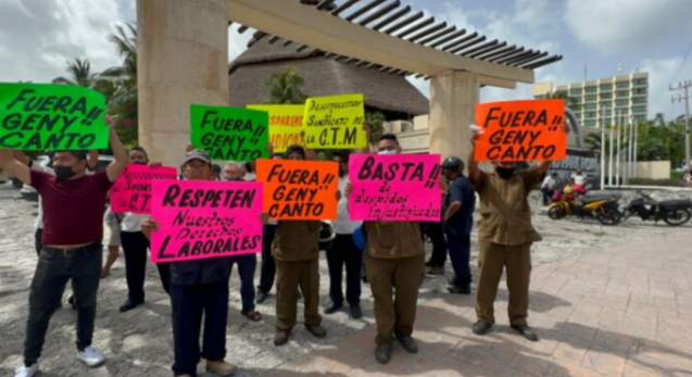 Plantados a las afueras de las instalaciones de este hotel, los trabajadores llevaban cartulinas contra la dirigente de la CTM en Cozumel, Genny Canto, y exigieron que sean atendidos por el gerente de este centro laboral.