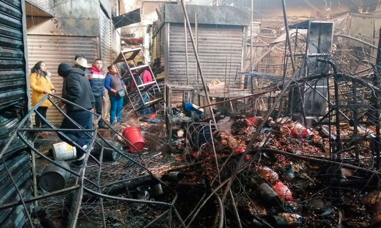 Con pasillos afectados por el fuego y pérdidas en mercancía, los locatarios revisan esta mañana los productos que aún se pueden rescatar de entre los escombros. Hombres, mujeres, adolescentes y cuerpos de seguridad, trabajan hombro a hombro con escobas y cubetas, para retirar las cenizas esparcidas por los pasillos quemados del mercado.