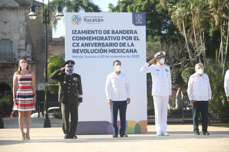 Mérida, Yucatán, 20 de noviembre de 2020.- En el marco del 110 aniversario del inicio de la Revolución Mexicana, el Gobernador Mauricio Vila Dosal encabezó en esta ciudad la ceremonia cívica de izamiento de bandera, con la que se recordó a este movimiento social que marcó un parteaguas en la historia del México moderno.