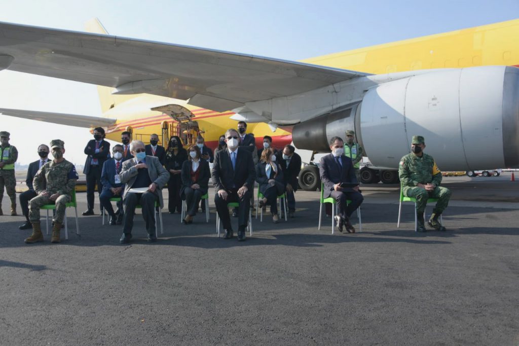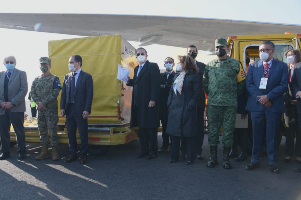 El secretario de Relaciones Exteriores, Marcelo Ebrard Casaubon, entregó simbólicamente el primer cargamento con vacunas a su contraparte de Salud, Jorge Alcocer Varela, para el inicio de la campaña de vacunación.