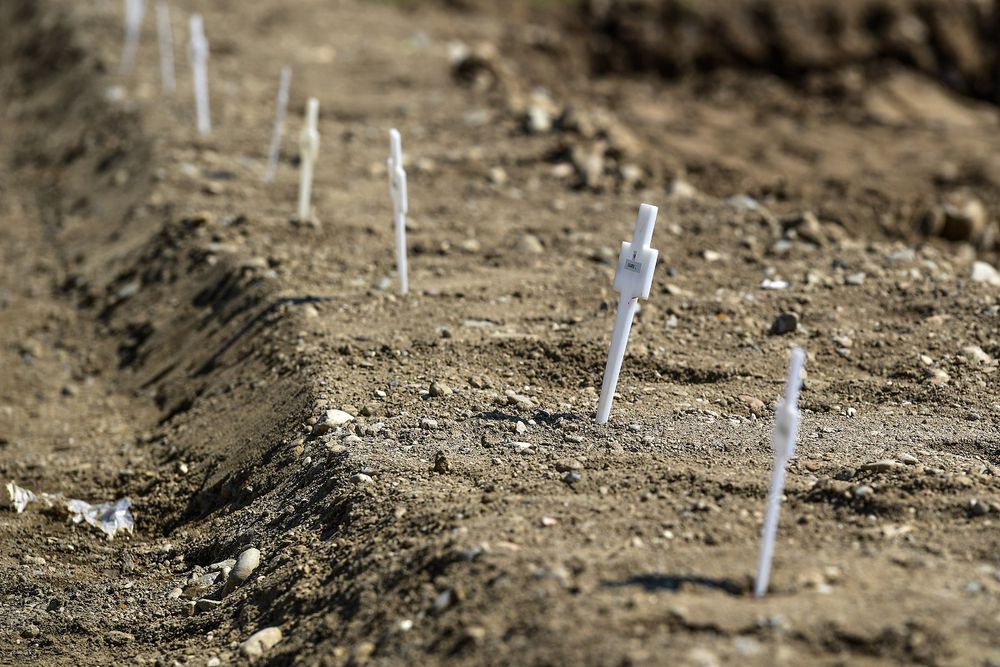 Hileras de pequeñas cruces blancas han sido alineadas frente a la sepultura excavada por un tractor. Todas llevarán el nombre del fallecido y las fechas de nacimiento y muerte.