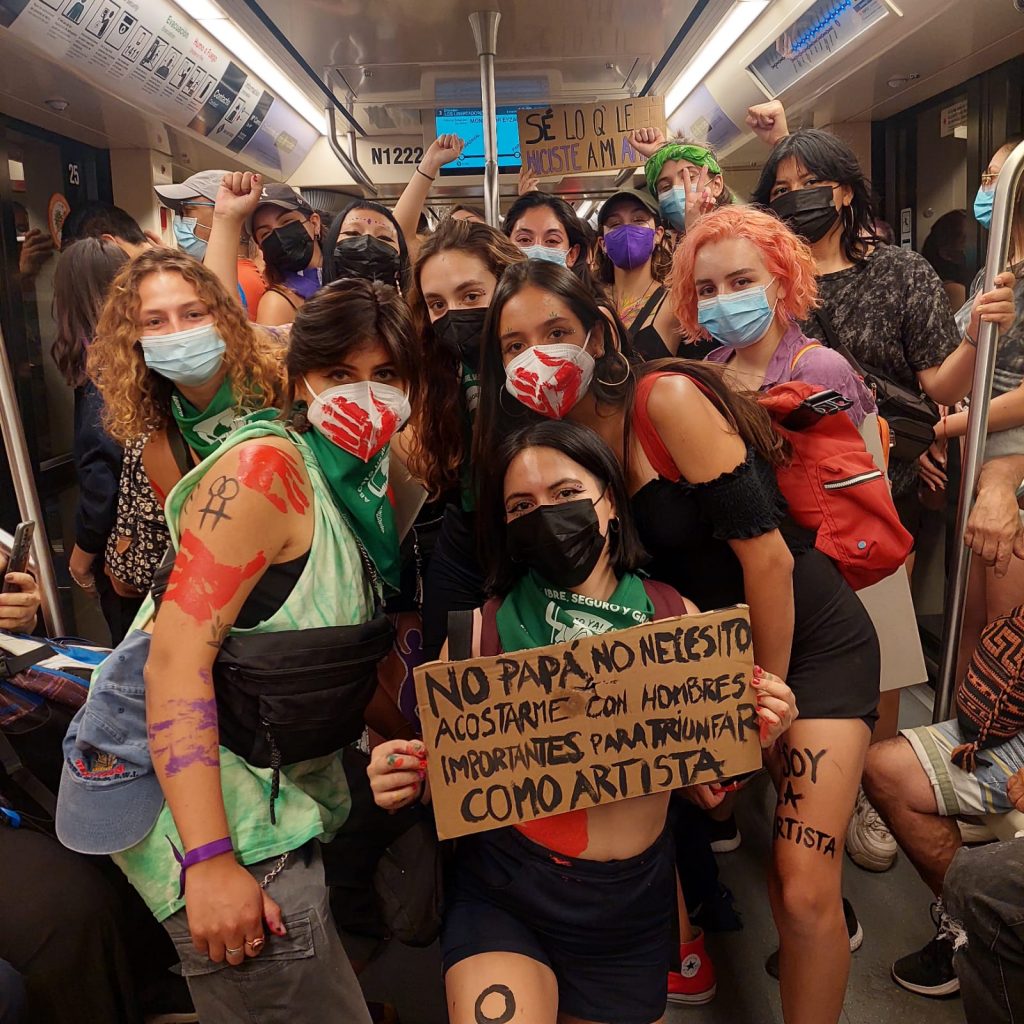Estudiantes de teatro UC en el metro rumbo al epicentro de las manifestaciones por el #DiaInternacionalDeLaMujer