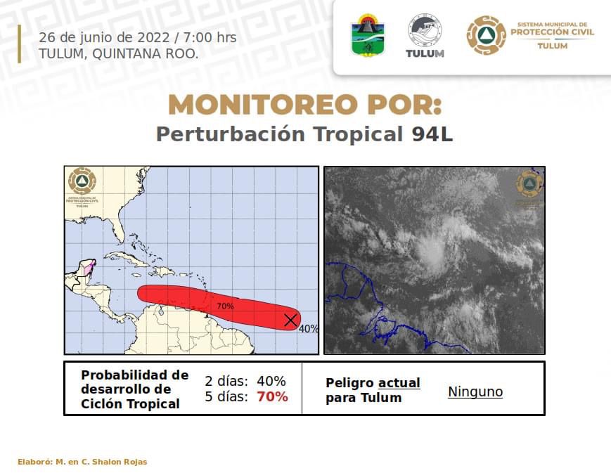 Se espera que evolucione a Depresión Tropical entre principios y mediados de la próxima semana. Por el momento continúa sin generar peligro para nuestro municipio y los modelos de pronóstico indican un desplazamiento del sistema hacia Centroamérica cerca de Nicaragua (info, preliminar sujeta a cambios) se continuará monitoreando para conocer futuras efectos en Quintana Roo.