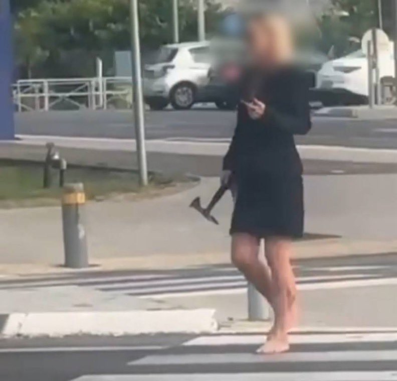 La mujer fue vista armada con un hacha mientras caminaba por la calle rumbo al centro comercial Seven Stars Mall, al norte de Tel Aviv. Tenía puesto un vestido negro, en una mano llevaba una bolsa del mismo color mientras en la otra portaba el arma blanca. Iba descalza, con las piernas y el rostro cubiertos de sangre.