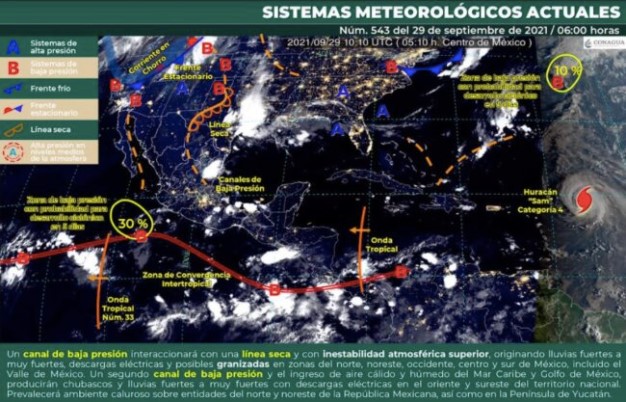 En el Atlántico, “Sam” ahora como Huracán de categoría 4 en la escala Saffir-Simpson, se localiza a 980 km al este de las Antillas Menores y a 3 mil 480 km al este de Cancún, Quintana Roo, muy lejos de costas mexicanas, pero el SMN mantiene vigilancia.