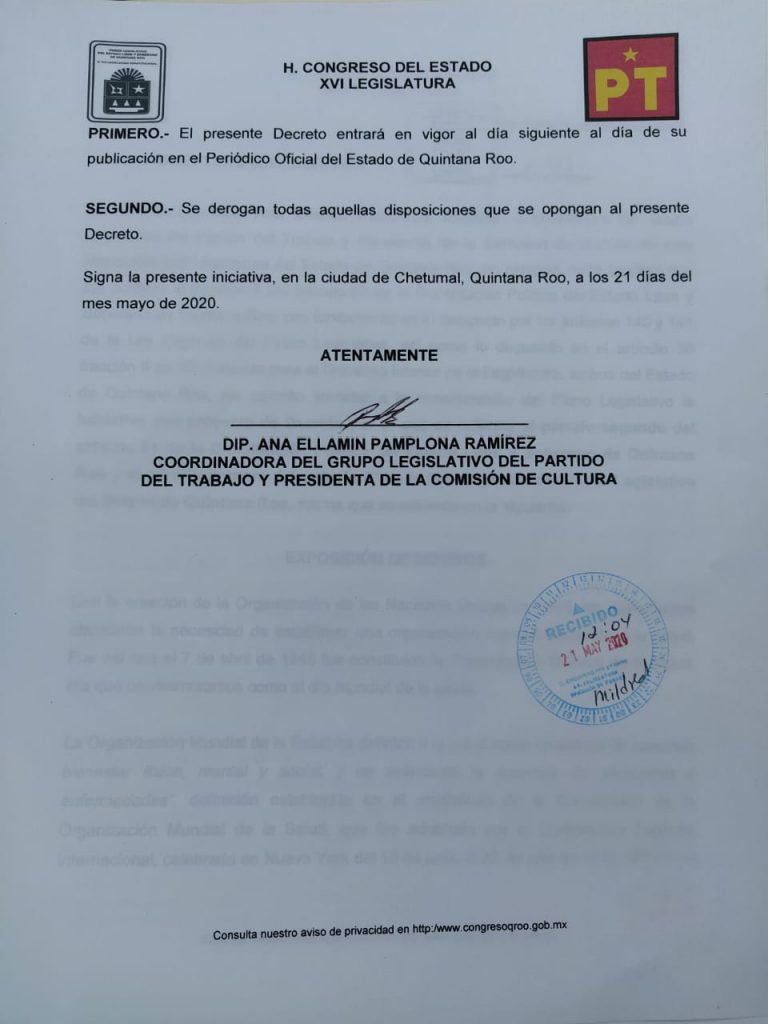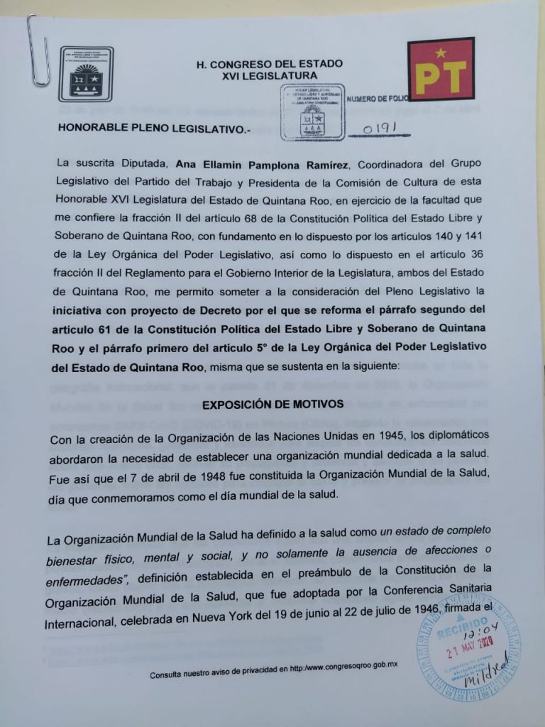 Por tal motivo, con el fin de evitar aglomeraciones de personas y cumplir con la encomienda y responsabilidad otorgada por la población, presentó ante oficialía de partes del congreso local, una iniciativa para reformar el Párrafo Segundo del Artículo 61 de la Constitución Política del Estado Libre y Soberano de Quintana Roo y el Primer Párrafo del Artículo 5º de la Ley Orgánica del Poder Legislativo para incorporar el uso de la tecnología en las sesiones de comisiones del Pleno, sesiones de comisiones y comisión permanente y de esta realizarlas de manera virtual.