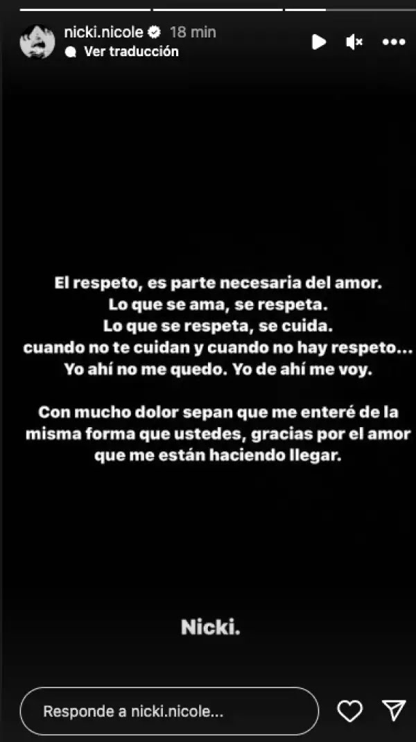 «El respeto es parte necesaria del amor. Lo que se ama, se respeta. Lo que se respeta, se cuida. Cuando no te cuidan y cuando no hay respeto… Yo ahí no me quedo. Yo de ahí me voy. Con mucho dolor sepan que me enteré de la misma forma que ustedes, gracias por el amor que me están haciendo llegar», posteó la argentina en sus historias de Instagram.