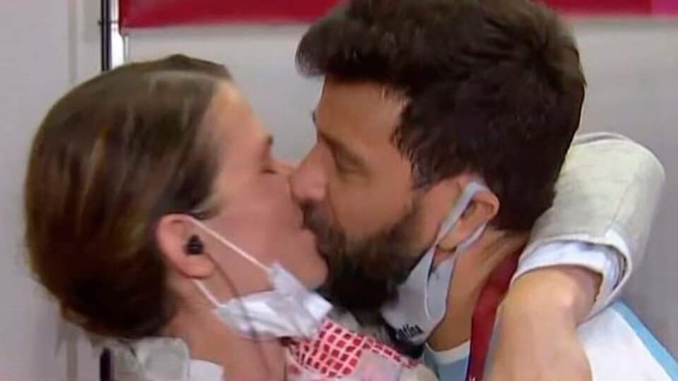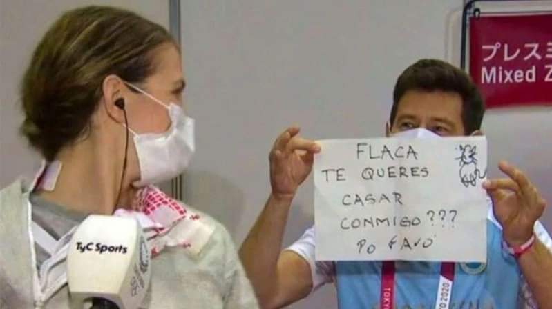 Mientras la esgrimista argentina contaba lo amargo de su derrota su pareja por 18 años se paró detrás de ella con una hoja que decía en mayúsculas: “flaca, te queres casar conmigo??? po favó ”.