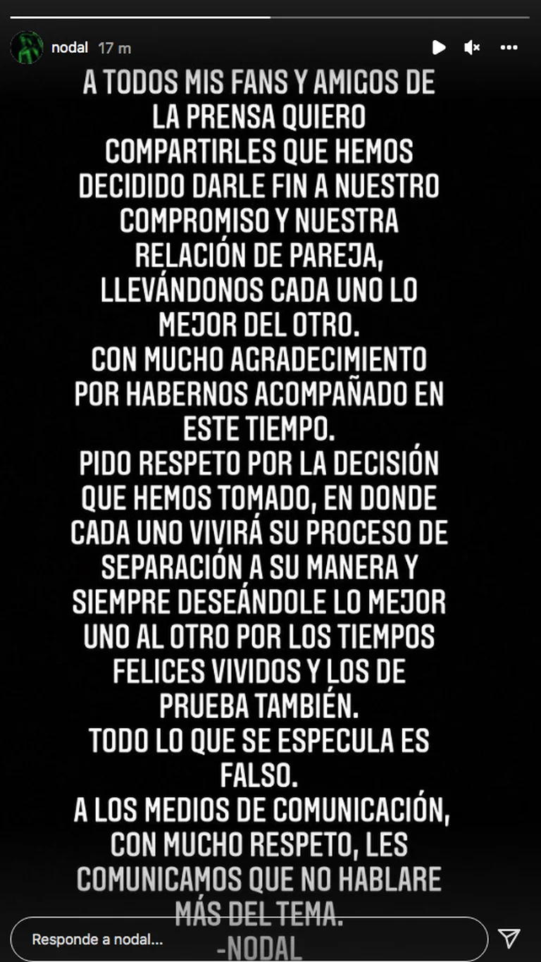 “A los medios de comunicación, con mucho respeto, les comunicamos que no hablaré más del tema. Nodal”, concluyó.