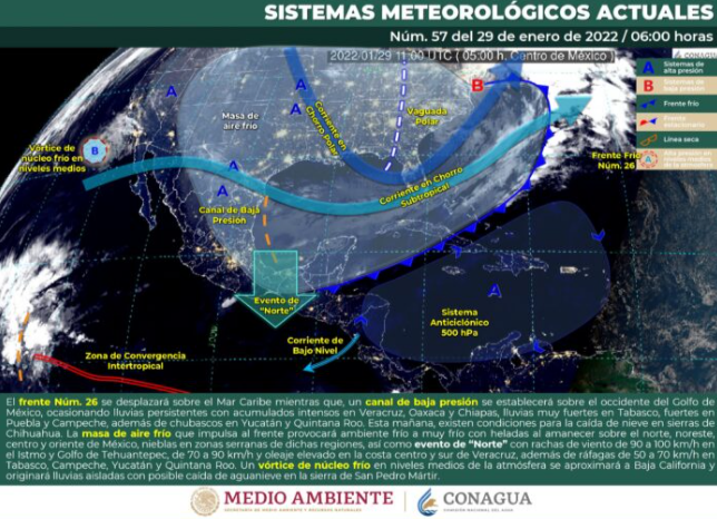 Por otro lado, el frente frío Núm. 26 se desplazará sobre el Mar Caribe mientras que, un canal de baja presión se extenderá sobre el occidente del Golfo de México, la interacción de ambos sistemas provocará lluvias persistentes con acumulados intensos (150 a 250 mm) en el sur de Veracruz, oriente de Oaxaca y en el norte de Chiapas, lluvias muy fuertes en Tabasco, fuertes en Puebla y Campeche, así como chubascos en Yucatán y Quintana Roo.