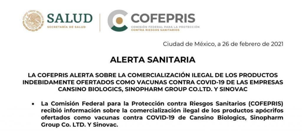 NUEVA ALERTA DE COFEPRIS POR VENTA DE VACUNAS CONTRA COVID19