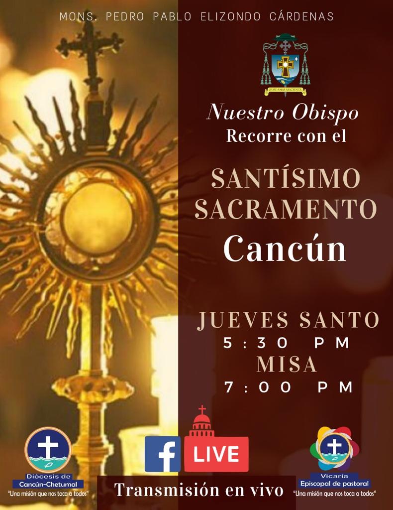 Cancún, Q. Roo, Jueves 09 de Abril de 2020, poderycrítica.- El Santísimo Sacramento será mostrado hoy a los feligreses católicos, ya que el Obispo de la Prelatura Cancún-Chetumal, Pedro Pablo Elizondo Cárdenas, hará un recorrido por diversos puntos de la ciudad.