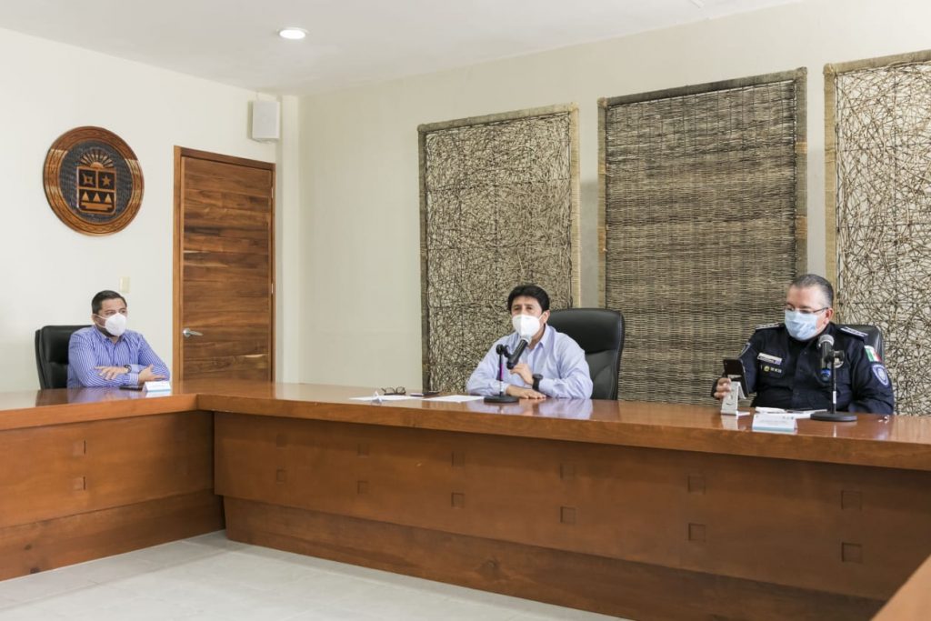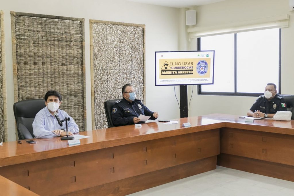 Tulum, Q. Roo, Miércoles 15 de Julio de 2020, poderycrítica.- En conferencia de prensa con el secretario de Seguridad Pública, Alberto Capella Ibarra, el presidente, Víctor Mas Tah, anunció que, en la primera sesión virtual de Cabildo, transmitida por redes sociales, se acordaron medidas para contener y detener el crecimiento acelerado de contagios en este destino turístico, haciendo obligatorio el uso de cubre boca en el espacio público.