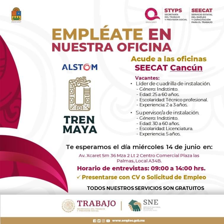 Los interesados podrán acudir a partir del miércoles a las oficinas del Servicio Estatal de Empleo y Capacitación para el Trabajo (SEECAT) de 9 de la mañana a 2 de la tarde en avenida Xcaret, súper manzana 36, manzana dos, lote dos, centro comercial Las Palmas planta alta.
