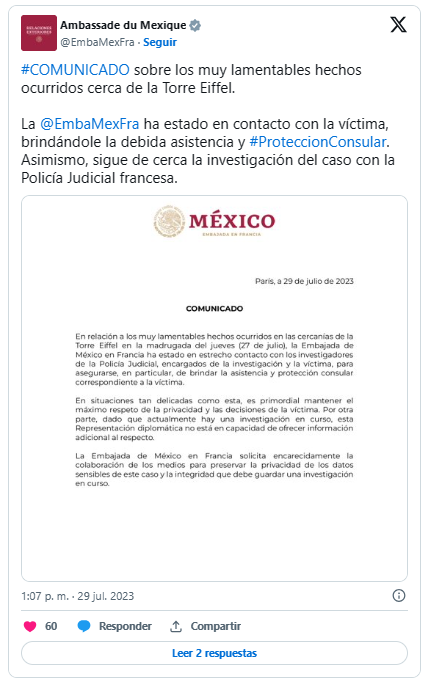La Embajada de México en Francia solicita encarecidamente la colaboración de los medios para preservar la privacidad de los datos sensibles de este caso y la integridad que debe guardar una investigación en curso», manifestó.
