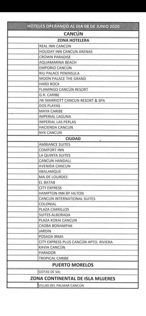 Cancún, Q. Roo, Lunes 08 de Junio de 2020, poderycrítica.- Unos 41 hoteles están operando en Cancún, zona continental de Isla Mujeres y Puerto Morelos, una vez que se reanudaron actividades este lunes 8 de junio.