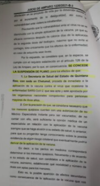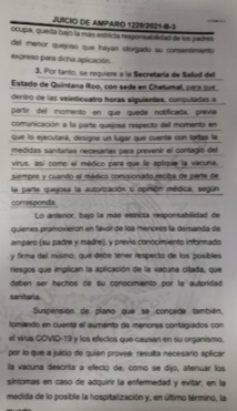El juez conocedor del caso ordena a la Secretaría de Salud de Quintana Roo, representada por Alejandra Aguirre Crespo, “proceda de inmediato a la aplicación de la vacuna contra el virus que ocasiona la enfermedad Sars-CoV-2, que se apta y esté aprobada por los organismos nacionales competentes para personas mayores de doce años”.