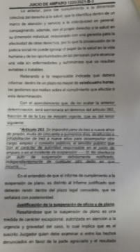 Además, el Amparo advierte que de no acatar la determinación, le aplicarán la fracción III del artículo 262 de la Ley de Amparo vigente: se impondrá pena de tres a nueve años de prisión, multa de cincuenta a quinientos días, destitución e inhabilitación de tres a nueve años para desempeñar otro cargo.