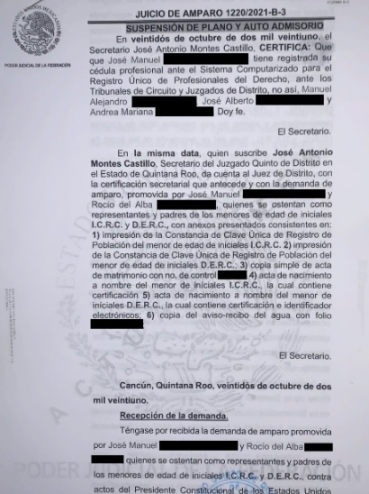Los menores I. C. R. C. y D. E. R. C., acudieron a la justicia federal por medio de sus representantes y la demanda de amparo la interpusieron el pasado 22 de octubre, la que fue registra en el Libro de Gobierno del Juzgado Federal con sede en Cancún, bajo el número 122072021-B-3; donde el acto reclamado es que sean vacunados contra el virus Sars-Cov-2 para la prevención del Covid-19, pues los menores tienen 14 y 16 años respectivamente.