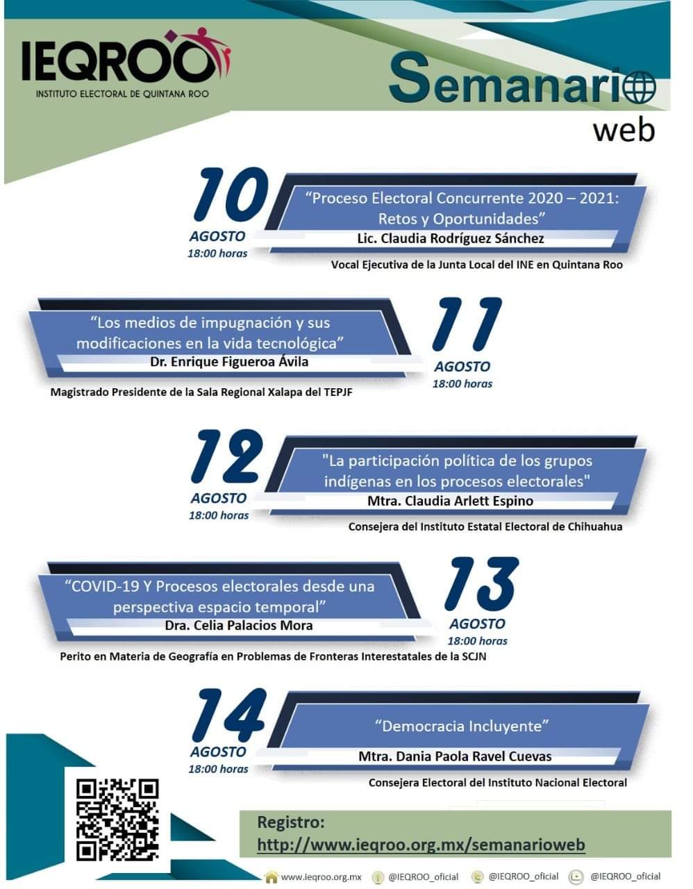 Hizo la invitación a los interesados para registrarse en http://www.ieqroo.org.mx/semanarioweb para conocer el programa, los temas como a los especialistas, dijo que, todas las videoconferencias serán transmitidas en vivo a partir de las 18:00 horas, a través de las redes sociales oficiales del Instituto por Facebook y YouTube: IEQROO_oficial.