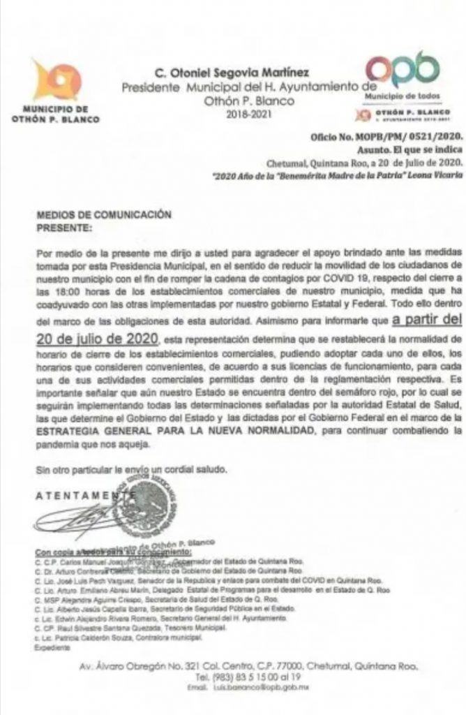 Chetumal, julio 21.- Aunque Chetumal es un foco rojo por el índice en la velocidad de contagio, la presidencia municipal de Othón P. Blanco, que encabeza Othoniel Segovia Martínez, no toma medidas restrictivas, sino que relaja la situación. Desde ayer la restricción horaria que imponía a los negocios de la capital del estadocerrar a partir de las seis de la tarde llegó a su fin, así lo informó el ayuntamiento de Othón P. Blanco a través de un oficio.