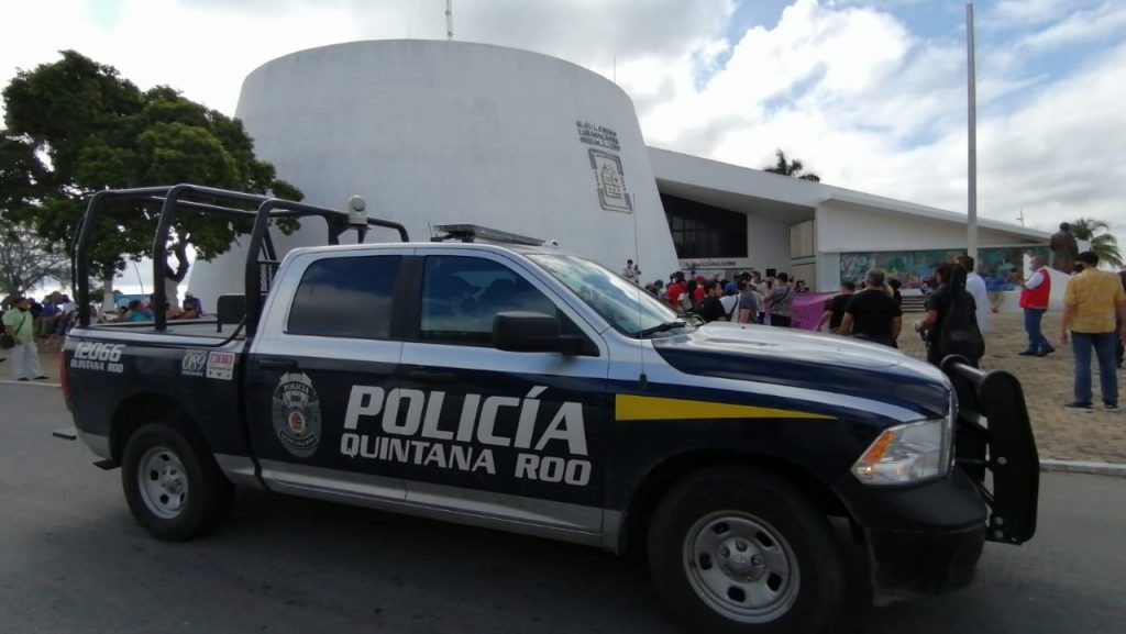 A distancia, en el parque “Los Caimanes” unos 100 elementos de la Policía Quintana Roo observaron la manifestación, para resguardar la integridad física de los mismos y de la población en general.