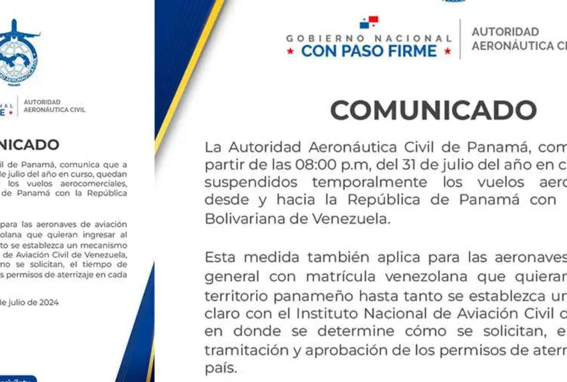 «El día de hoy se ha instruido al director de aeronáutica civil (Rafael Cárdenas) aplicar la medida de retorsión de la suspensión de los vuelos aerocomerciales de Venezuela a Panamá y Panamá a Venezuela», informó la vocera del gobierno panameño, Sareis Pineda.