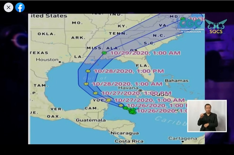 “En la noche madrugada tenga un ligero giro hacia el norte. A mediodía se mantendría en tierra como Huracán categoría 1 y el 27 de octubre saldría de territorio mexicano hacia el Golfo (de México)”.