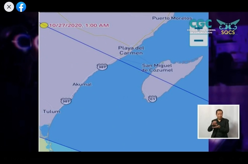 Entraría por Xpu Há, cerca de Puerto Aventuras, aunque esto puede cambiar, en el municipio de Solidaridad, se estima que a las 6:00 de la tarde de hoy entre a Cozumel, para posteriormente seguir su camino hacia el Continente.