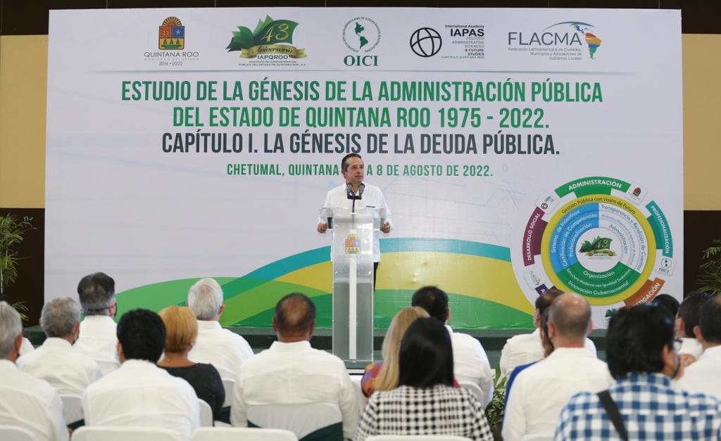 PODER Y CRÍTICA | REDACCIÓN | El gobernador Carlos Joaquín encabezó hoy la presentación del Estudio de la Génesis de la Administración Pública del Estado de Quintana Roo 1975-2022, en su Capítulo I La Génesis de la Deuda Pública, organizado por el Instituto de Administración Pública del Estado de Quintana Roo (IAPQROO).