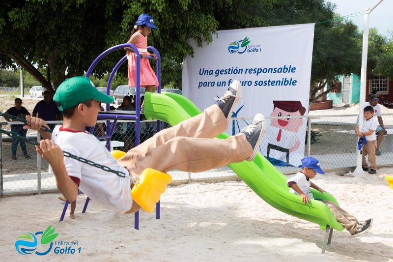 Es de esta forma que la compañía ha donado tres parques infantiles, uno en la localidad de Yalsihón y los otros dos en Dzilam de Bravo, donde se encuentra operando el proyecto Eólica del Golfo 1 con 28 aerogeneradores y una capacidad de generación de 70 megawatts (MW).