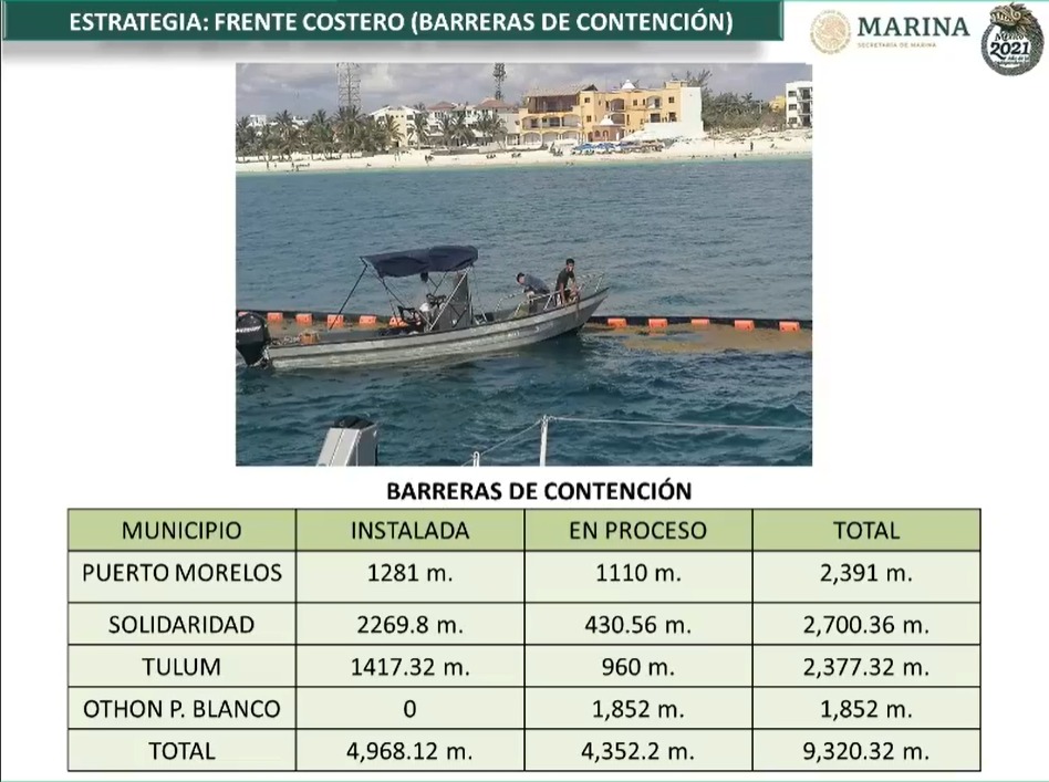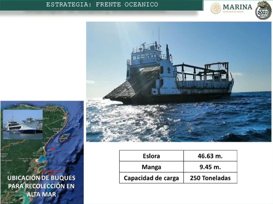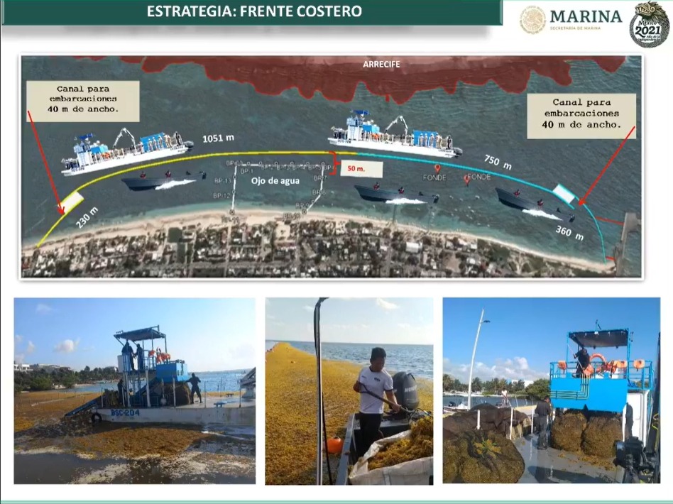En este mismo escenario el contralmirante Alejandro López Zenteno de la Secretaría de Marina (SEMAR) coordinador Nacional de la Estrategia para la Contención del Sargazo en las Costas de Quintana Roo explicó que, la atención del fenómeno de sargazo se realiza recolecta en tres frentes: Oceánico, Costero y en Playas. Cubriendo el Frente Oceánico trabaja un Buque de Investigación Oceanográfica y una Patrulla Oceánica. En el Frente Costero se recolecta con 11 sargaceras, 19 embarcaciones menores y con barreras. En el Frente de las Playas con 361 elementos de SEMAR y 618 municipales.