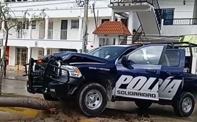 PODER Y CRÍTICA | Una patrulla de la Secretaría de Seguridad Pública de Solidaridad terminó estrellada contra un árbol del camellón centro de la avenida 96 con 90.