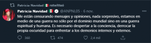 “Me están censurando mensajes y opiniones, nada sorpresivo, estamos en medio de una guerra no sólo por el dominio mundial sino en una guerra espiritual y humana. Es necesario despertar a la conciencia, derrocar la propia oscuridad para enfrentar a los demonios internos y externos”, escribió Paty Navidad.