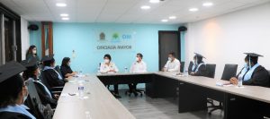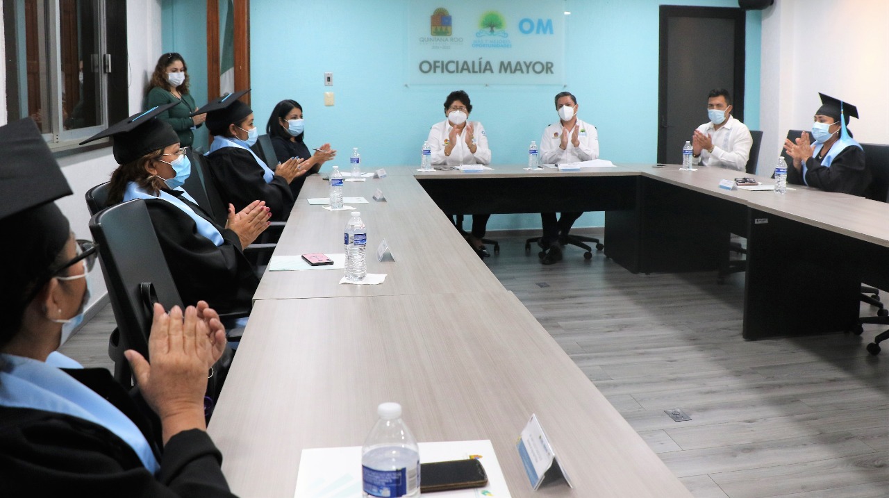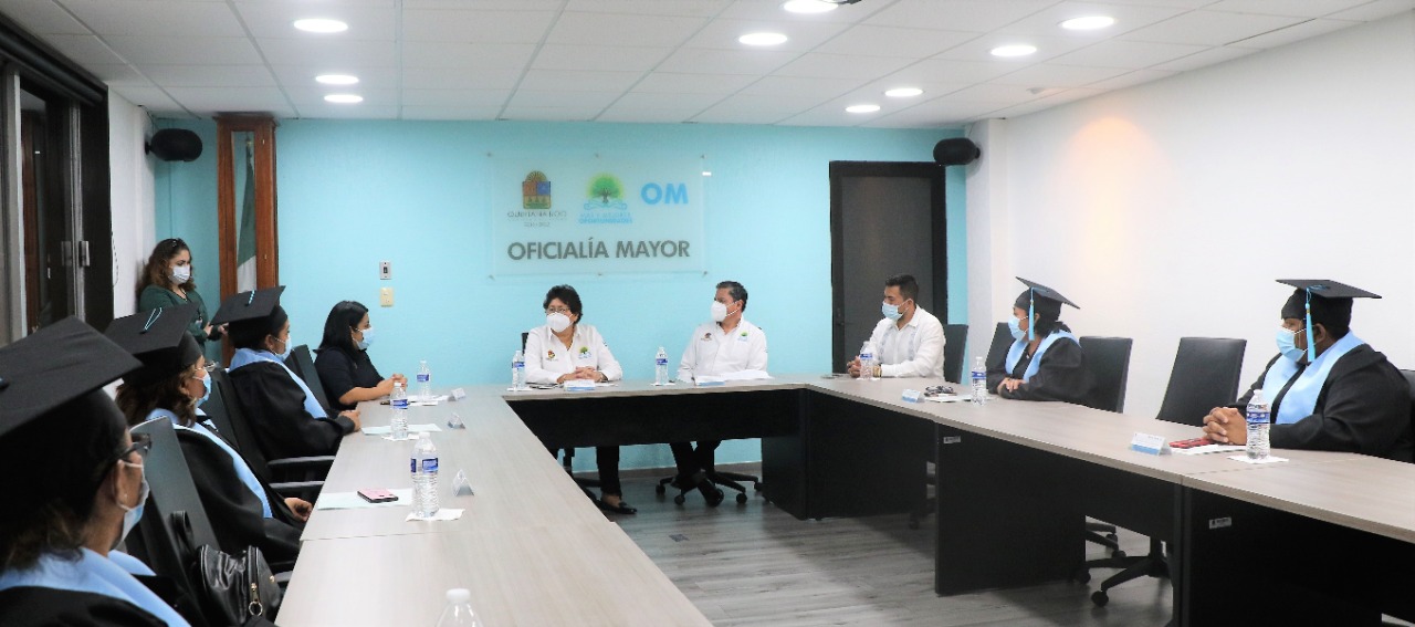Yohanet Torres Muñoz, encargada del Despacho de la Oficialía Mayor se reunió con las y los graduados y reconoció el esfuerzo y dedicación de servidores públicos estatales de los municipios de Othón P. Blanco y Benito Juárez que aprovecharon las facilidades y apoyos que les fueron brindados para lograr acreditar su bachillerato a través del examen de CENEVAL.