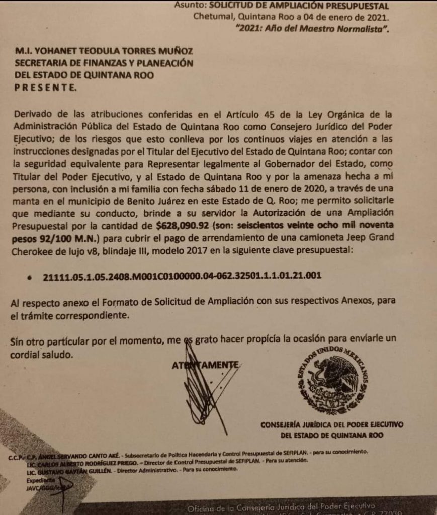 Chetumal, Q. Roo, martes 18 de mayo de 2021, poderycrítica.- El Consejero Jurídico del Poder Ejecutivo, Antonio Villalobos solicitó una ampliación presupuestal superior al medio millón de pesos, para rentar una camioneta blindada tras haber sido amenazado de muerte meses atrás, en una narco-manta colocada en Cancún.