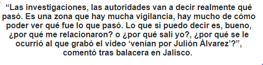 El cantante contó que unos momentos antes se estacionó cerca de una cafetería por la zona donde se suscitó la balacera, en la Plaza Andares en Puerta de Hierro, pero no estuvo presente cuando ocurrieron los hechos. Sin embargo, cree que algunas personas que lo vieron pudieron relacionarlo con la balacera y un supuesto secuestro.