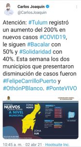 Lo anterior, después que el gobernador del Estado, Carlos Joaquín González diera a conocer en el programa “Enlace Ciudadano” las estadísticas de contagio de los municipios de Quintana Roo, donde destacó: Atención Tulum registró un aumento del 200% en nuevos casos de Covid-19, le siguen Bacalar con 50% y Solidaridad con un 40%, posteó el Mandatario Estatal.