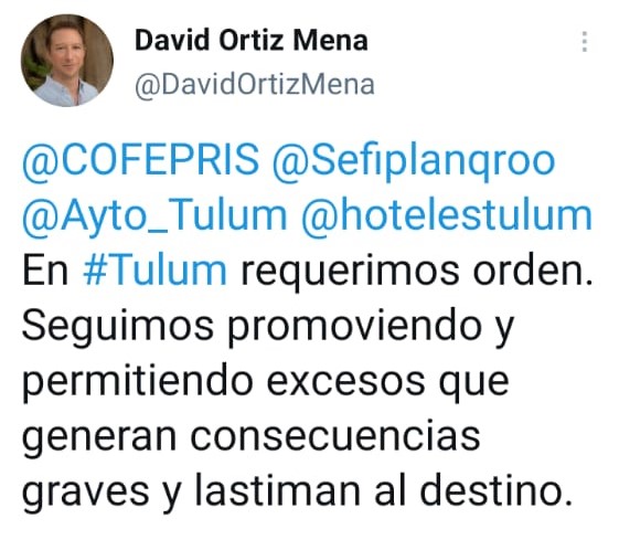 Tulum, Q. Roo, Viernes 02 de Abril de 2021, poderycrítica.- El presidente de la Asociación de Hoteles de Tulum, David Ortiz Mena hizo un llamado a las autoridades de la Comisión Federal de Protección contra Riesgos Sanitarios (COFEPRIS), a la Secretaría de Finanzas y Planeación de Quintana Roo (SEFIPLAN) y al Ayuntamiento de Tulum para que tomen cartas en el asunto, ante el incremento del 200% de contagios por Covid-19.