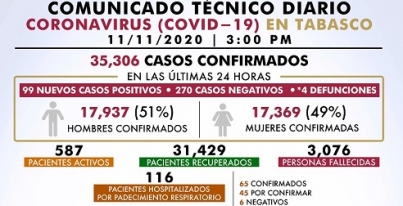 Tabasco, Miércoles 11 de Noviembre del 2020, poderycrítica.- Al informar que en las últimas horas se presentaron 99 nuevos casos positivos, 270 negativos y cuatro defunciones por COVID-19, la Secretaría de Salud continuó con su llamado a los tabasqueños para seguir aplicando las medidas higiénicas, con el fin de evitar un mayor número de contagios y saturar hospitales y unidades médicas. Observó que este día refleja un incremento en el número de casos positivos.